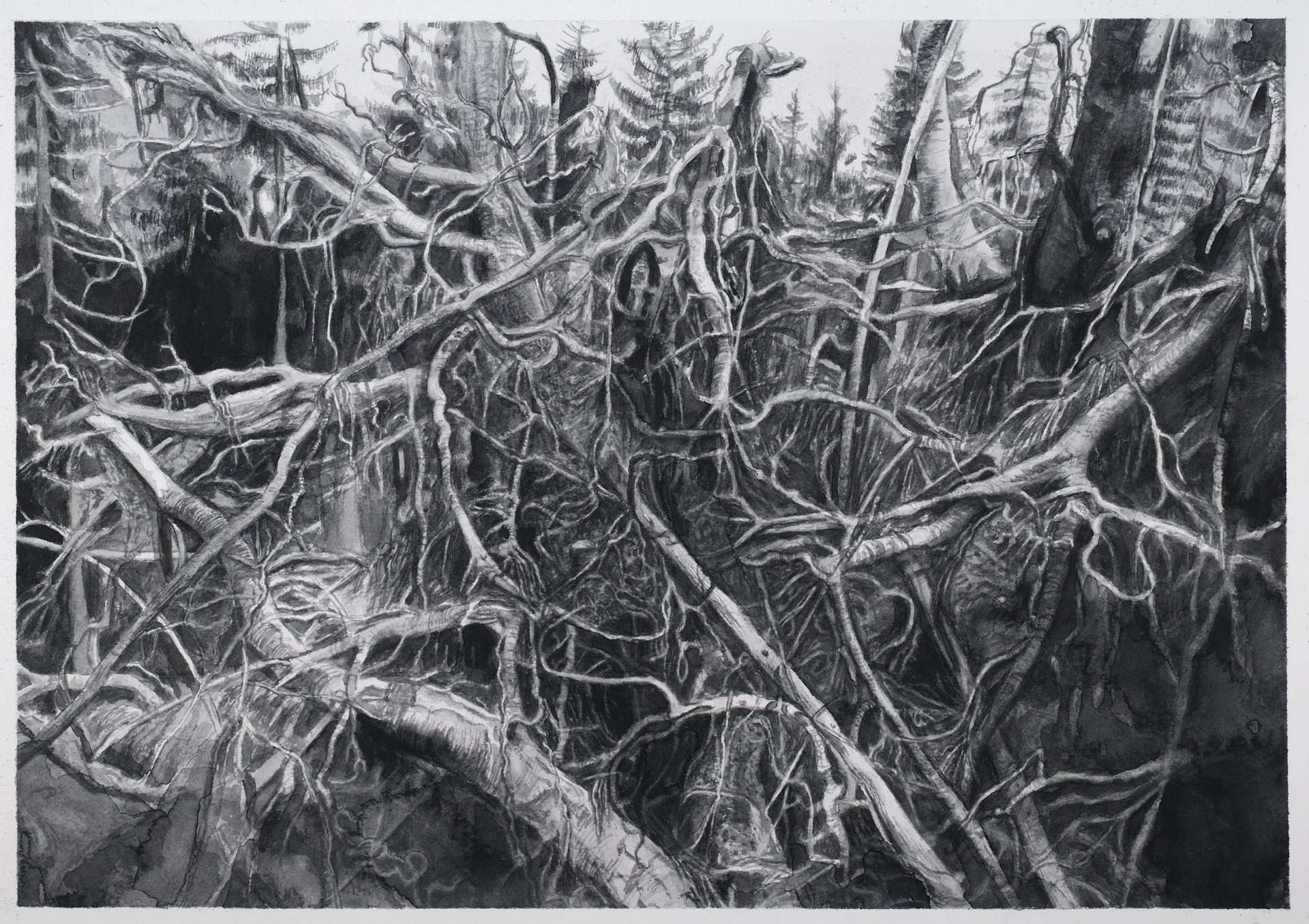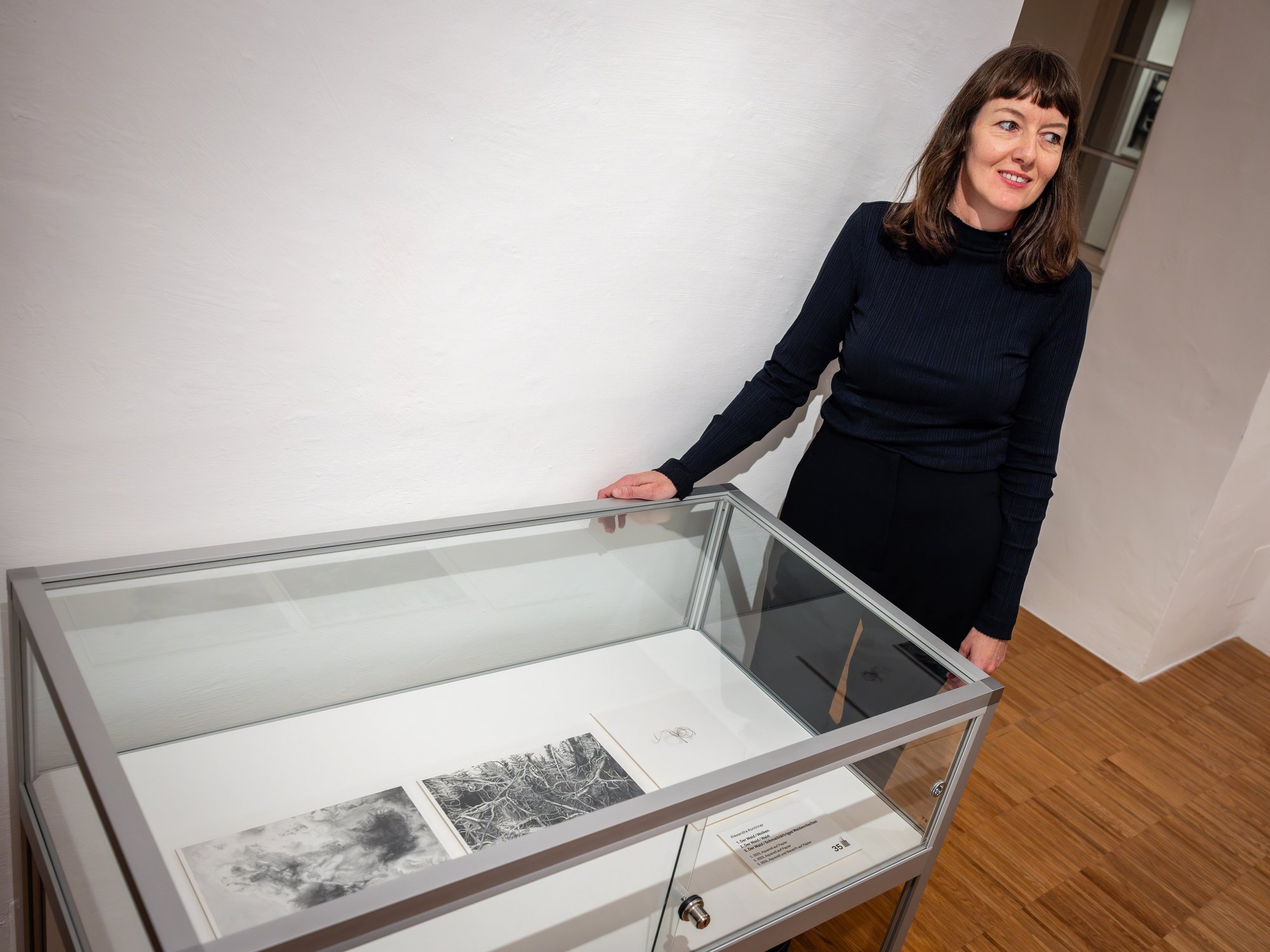 Alexandra Kontriner ist in Tirol geboren, sie lebt und arbeitet in Wien. Ihre dreiteilige Arbeit Der Wald reflektiert den Klimawandel und die Auswirkungen der Globalisierung. Mit präziser Beobachtungskraft schafft sie filigrane Aquarelle und Zeichnungen, die von den Betrachtenden dasselbe einmahnen: genau hinzusehen, auf die Kunst und auf die Welt um uns herum.