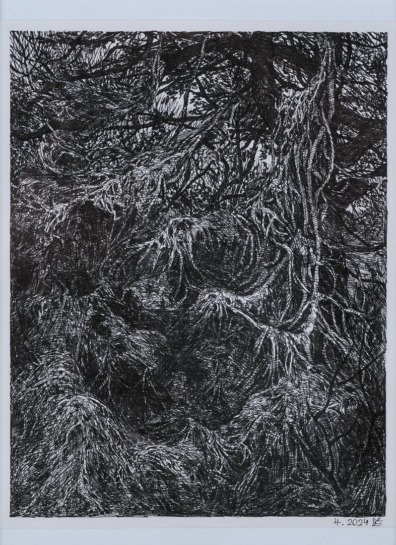 Leonhard Lorenz Knabl, geboren in Imst in Tirol, überzeugt mit seiner detailliert gearbeiteten Tuschezeichnung 53.009717,-6.327626. Ein Waldstück zeigt eine feine Balance zwischen Naturalismus und abstrakter Struktur - eine Welt der Träume und der Fantasie. Sein Werk, inspiriert von Film und Literatur, verbindet narrative Tiefe mit einer schwarz-fantastischen Atmosphäre.