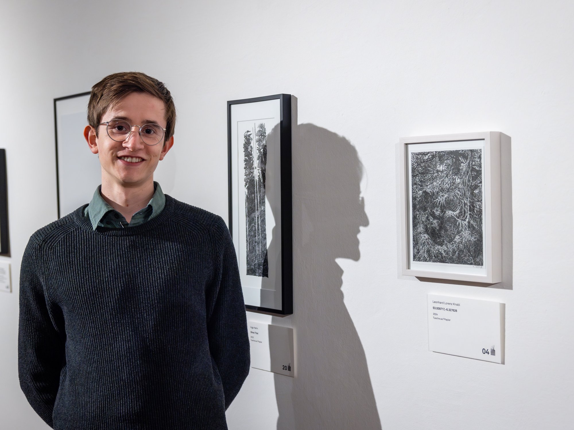Leonhard Lorenz Knabls (geb. 1999 in Imst) kleinformatiges Waldstück hat in seiner kammermusikalischen Feinheit die Jury überzeugt. Sensible Tuschestriche übersäen das Blatt Papier. In seiner monochromen Schwärze und Ausschnitthaftigkeit wird der Naturalismus in eine abstrakte Struktur aufgelöst. Der Bildtitel "53.009717, -6.327626" verweist auf die Koordinaten des Referenzortes der Zeichnung, die ein Unterholz darstellt. „Interessiert man sich nicht für die Vorlage, so sagen die Koordinaten ohne weitere Recherche allerdings auch nichts über den Ort und die Gestalt der Vorlage, oder die Deutung des Bildes, aus. Das Gestrüpp (oder was auch immer man im Bild erkennen will) ist austauschbar und könnte sich überall auf der Erde, oder auch in der Welt der Träume und Fantasien, befinden.“ So der Künstler.