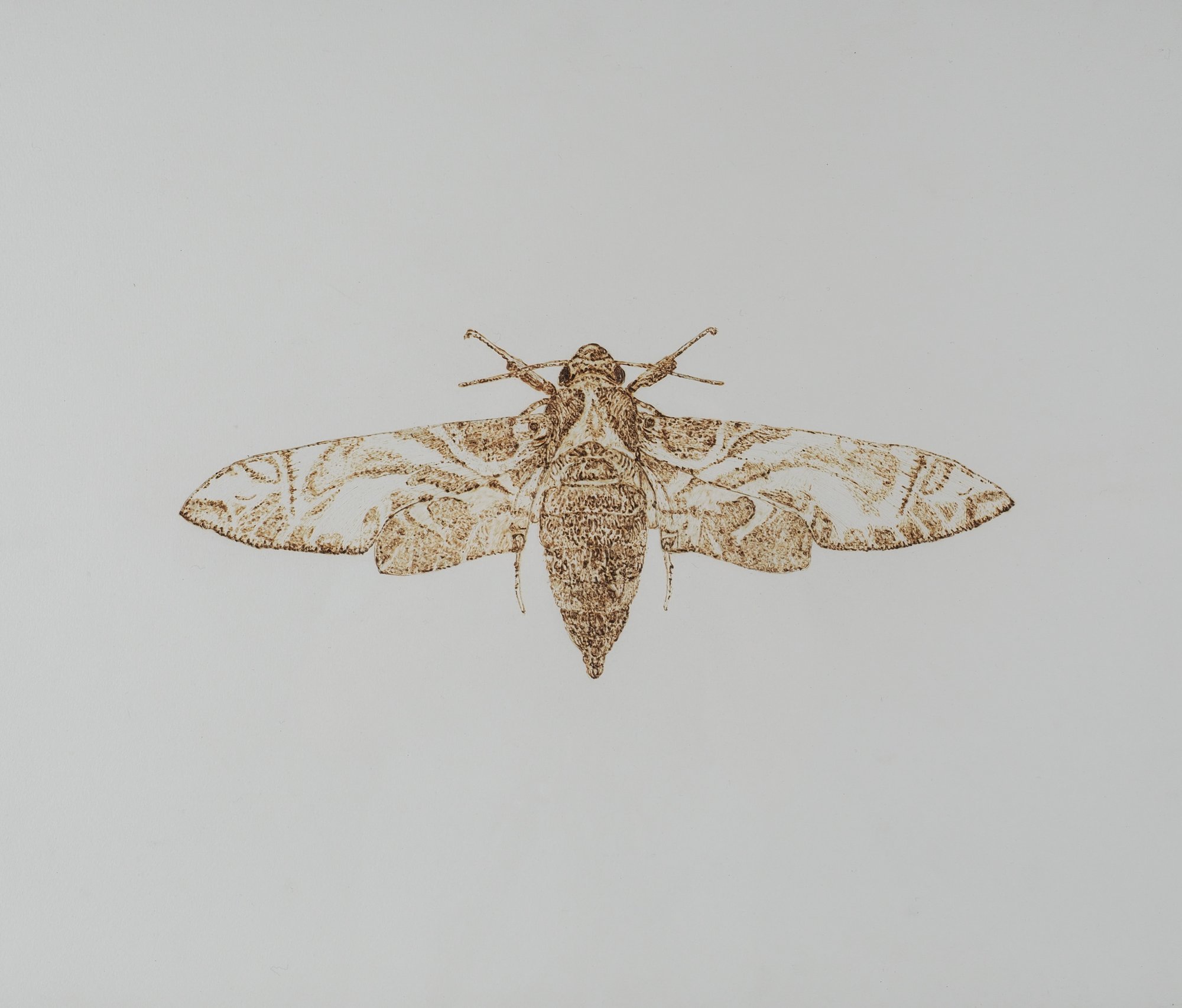 These works are hyperrealistic depictions of moths, not drawn but burned into the paper using pyrography. The technique reflects the fatal attraction of light to the moths, literally causing them to burn. One sheet suggests a central light source, sought out by individual moths at the edges of the swarm. The other sheet presents a single moth magnified to a monumental scale, with intricate detail reminiscent of historical natural science illustrations.